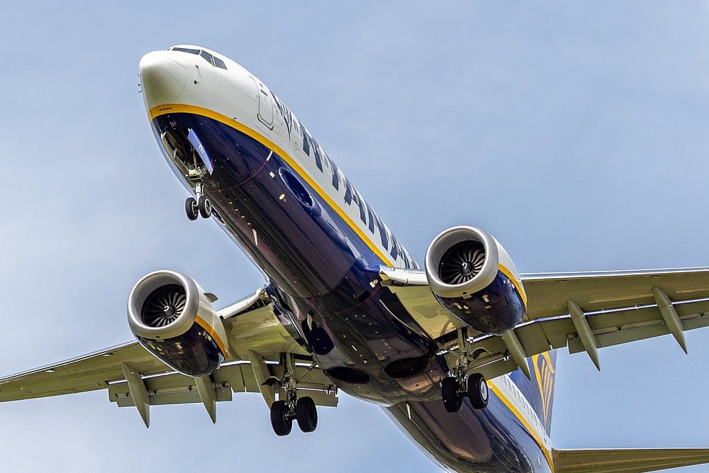 Dieses eindrucksvolle Foto zeigt ein Ryanair-Flugzeug, das majestätisch durch den klaren, blauen Himmel schwebt. Das Flugzeug, das aus einem niedrigen Winkel betrachtet wird, hebt die Unterseite des Rumpfes und der Tragflächen hervor, während es aufsteigt, wobei die Triebwerke kraftvoll und eindrucksvoll nach vorne kommen. Die leuchtenden Farben des Flugzeugs, das charakteristische Blau und Gelb von Ryanair, stehen in lebhaftem Kontrast zum Himmelshintergrund und tragen zur Dynamik und Energie der Szene bei.