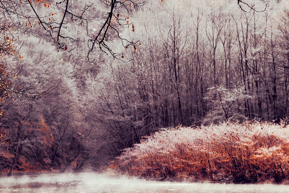 Wupper an einem kalten Wintermorgen mit Raureif auf den Bäumen und aufsteigendem Nebel über dem Wasser