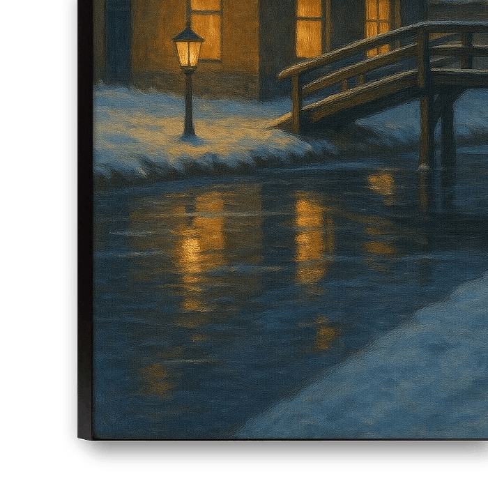 This scene feels lifted from another century — a vision of simplicity, isolation, and grace. The artist renders it with the precision of realism and the tenderness of memory. Every surface glimmers with reflected light: the soft golden windows mirrored in the canal, the faint sheen of snow under lamplight, the almost imperceptible shift from dusk to night.