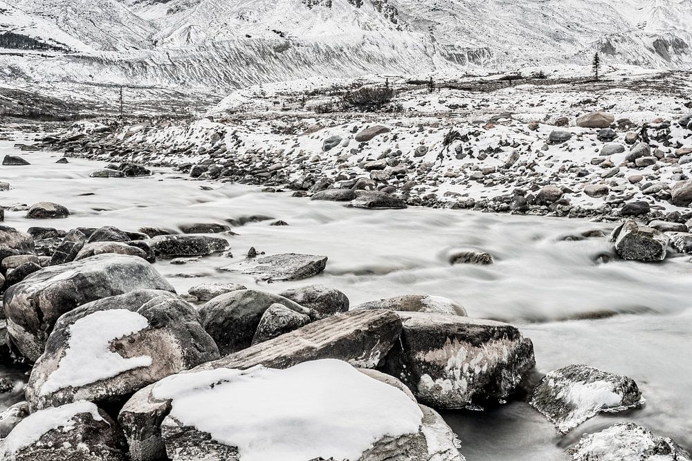 In den höheren Lagen der kanadischen Rocky Mountains löst der Winter den Herbst schon früher ab. Es wird empfindlich kälter. Der Schnee zaubert feste Strukturen in die Berge im Hintergrund. Im Vordergrund bringt der Fluss etwas Bewegung in das Bild. Der Nebel in den Bergen trägt zur winterlichen Atmosphäre bei.