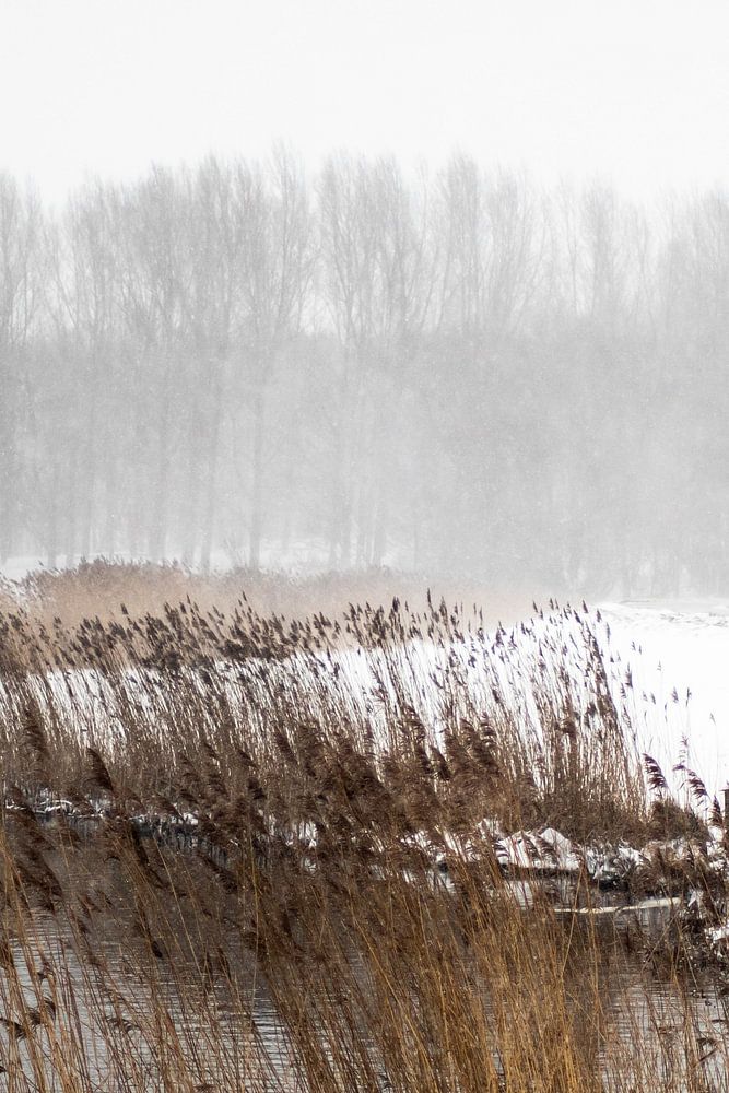 Auf dem Deich am Schwarzwasser in Zwolle. Hinter dem Ortsteil Holtenbroek ist dieser Weg und dieses Bild im Winter zu finden. Hier können Sie sehen, wie bei starkem Schneefall der Kontrast zum Schilf in den Vordergrund tritt.
