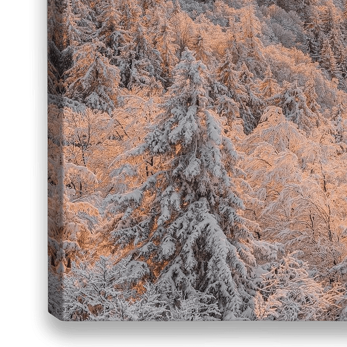 Blick vom Schauinsland über den tief verschneiten Schwarzwald kurz bevor die Sonne hinter einer Nebelbank verschwindet. Sie schafft es gerade noch, die Bäume im Vordergrund in ein schönes Orangerot zu tauchen.