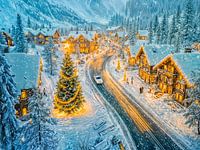Ein bezauberndes Winterbergdorf, weihnachtlich geschmückt mit schneebedeckten Dächern und einem funkelnden Tannenbaum. Gemütliche und festliche Atmosphäre.