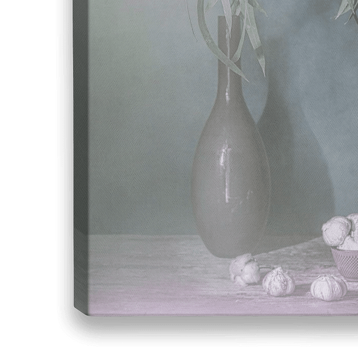 Stilleben mit Eukalyptus und Knoblauch in Weißtönen, das sich aufgrund seiner Weißtöne leicht in den Raum einfügen lässt. Auch geeignet als Rundfoto, Wandtapete, Poster.