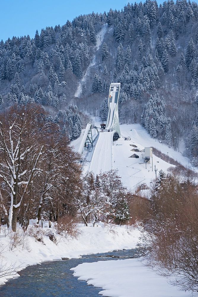 Winterlandschaft an der Loisach in Garmisch. Blick über den Fluss zur Skiflugschanze