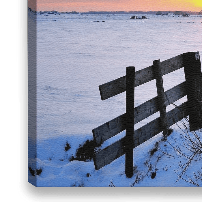 Winterliche Landschaft im IJsseldelta während eines bunten Sonnenuntergangs. Die Weide ist mit Schnee bedeckt und im Graben befindet sich Eis.