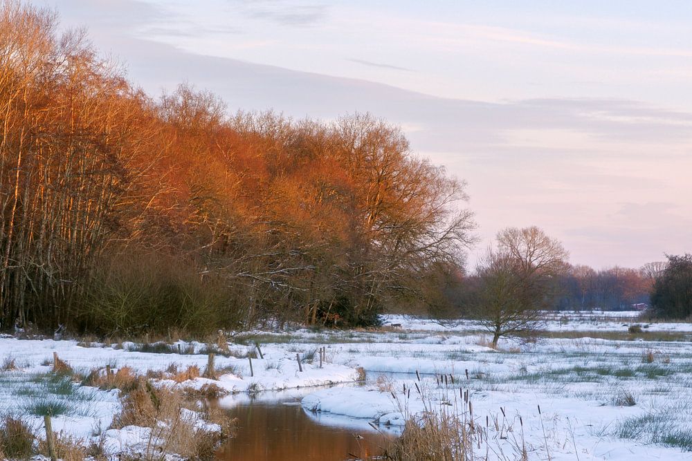 Im Grenzgebiet zwischen Drenthe und Overijssel liegt der wunderschöne Fluss Reest. Ich komme gerne am Ende des Tages hierher. Dann scheint das letzte Sonnenlicht wunderschön auf die Bäume. Im Wasser des Baches ist dann ein schöner Spiegelbild zu sehen. Es hat geschneit und ein Reh steht in der Ferne am Waldrand.
