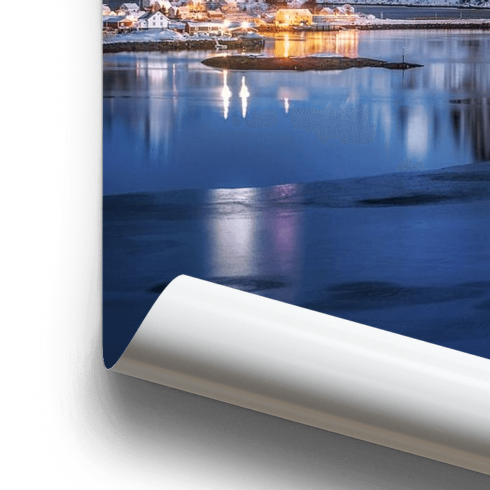 Fjordlandschaft mitten in der Natur mit Bergen und dem Fischerdorf Reine im Winter zur blauen Stunde.
