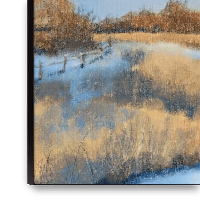 Digitale Pastellkreidezeichnung einer Landschaft zu Beginn des Winters, mit einem Fluss, Bäumen und Sträuchern im Hintergrund und einem klaren blauen Himmel.