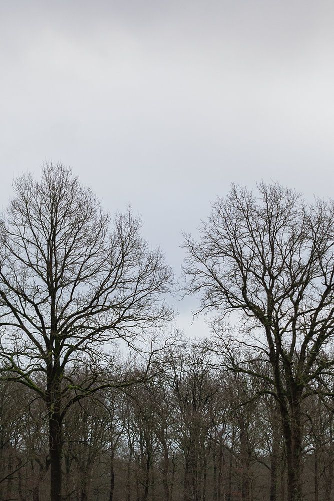 Zwei kahle Bäume auf einem kargen Feld entlang eines kahlen Waldrandes