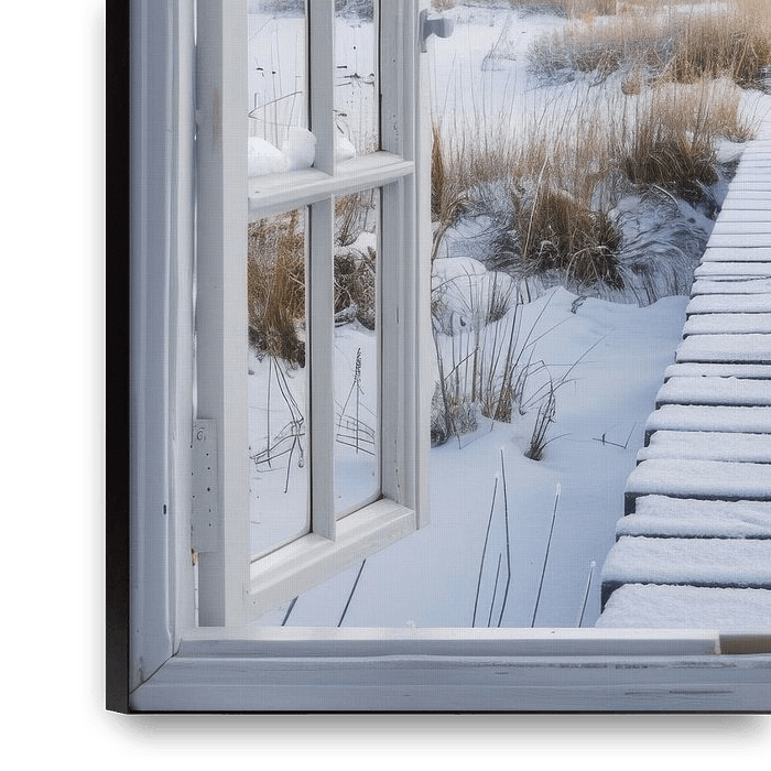 Tauchen Sie ein in die friedliche Schönheit einer verschneiten Winterlandschaft, eingefangen durch ein geöffnetes Fenster. Die unberührte Schneedecke und der klare, blaue Himmel schaffen eine beruhigende Atmosphäre, die perfekt in jeden Raum passt. Ideal für Liebhaber von Natur und Winter, bringt diese Szene eine erfrischende und…