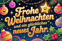 Das Foto präsentiert eine einladende Weihnachtsszene, die mit einem warmen, festlichen Hintergrund geschmückt ist. Der Hintergrund ist in sanften Rottönen gehalten, durchzogen von goldenen Lichtern, die in einem sanften Bokeh leuchten und eine besinnliche Atmosphäre schaffen. Im Vordergrund sind Weihnachts- und Neujahrswünsche…