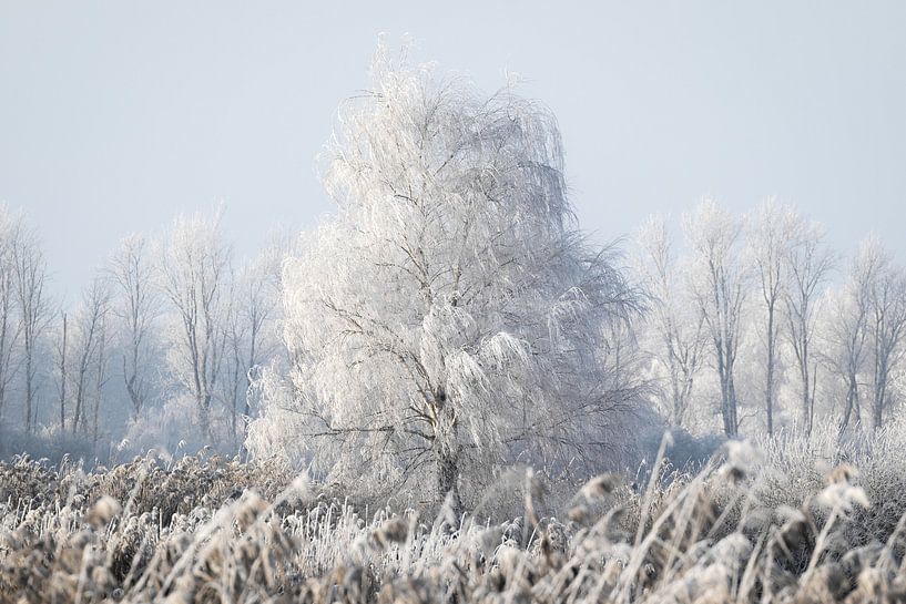 Bestelle das Foto Winterliche Stille: Verschneite Birke im Raureif von Nils Steiner als Reproduktion auf Leinwand, Alu-Dibond, als Poster, Fototapete oder Acrylglasbild.