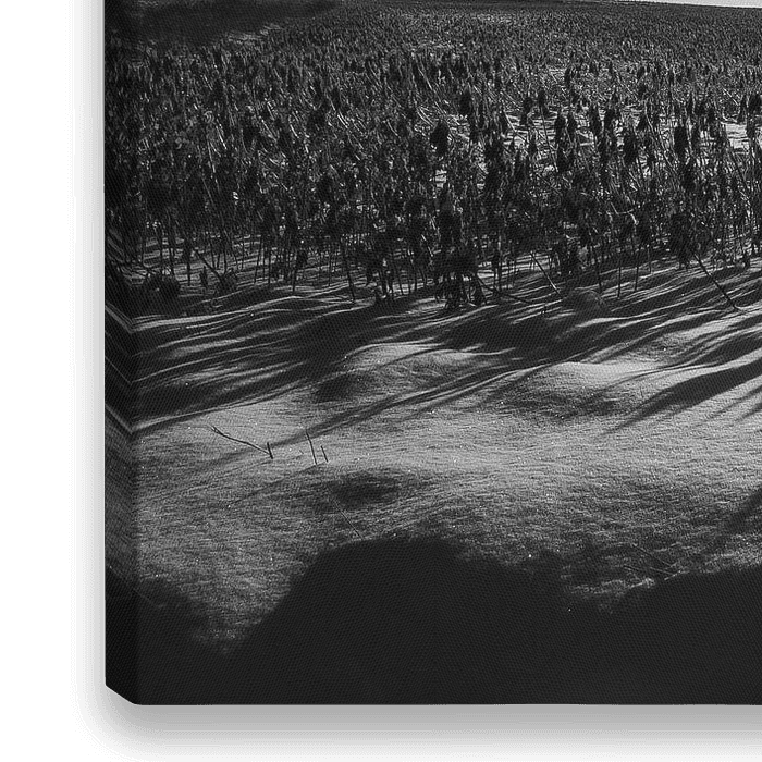 Ein winterliches Feld liegt unter der hellen Sonne, die lange Schatten auf den Schnee wirft, wobei der Kontrast zwischen Licht und Dunkelheit eine karge, strahlende Landschaft schafft.