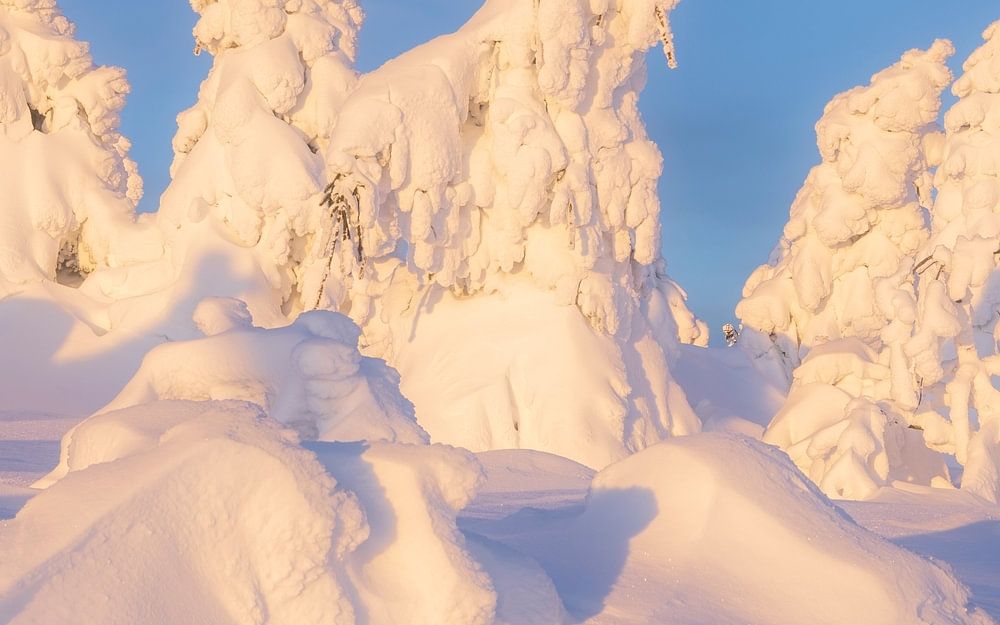 Tief verschneite Bäume im Licht der aufgehenden Sonne. Das Licht im Winter ist immer besonders schön.