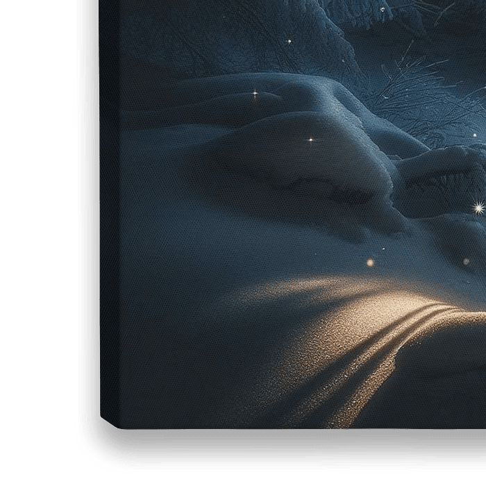 Ein magischer Winterwald wird in diesem Bild zum Leben erweckt, in dem lange Eiszapfen von den Zweigen herabhangen, umgeben von einem sanften Glanz der Sterne. Die Bäume sind mit Schnee bedeckt, der das Licht der Sterne einfängt und funkelnde Reflexionen über den verschneiten Boden wirft. Die Nacht ist klar und die Sterne leuchten hell,…