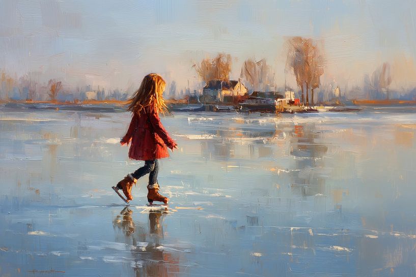 Eine rein holländische Winterszene, in der ein Mädchen in aller Ruhe über das Natureis schlittelt. Der Moment wirkt einfach und echt, als ob die Zeit für einen Moment stehen geblieben wäre. In der Ferne sind Bauernhäuser und kahle Bäume zu sehen, die sich sanft im glatten Eis spiegeln und dem Bild einen offenen und weitläufigen…