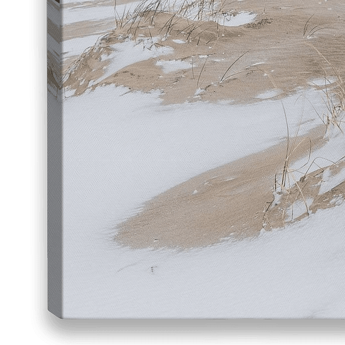 Strand und Schnee. Eine 'contradictio in terminis', könnte man fast sagen. Auf diese Weise kommen die Strukturen noch besser zur Geltung. Obenauf steht stolz aufrecht etwas kurzes Marram-Gras, grüner als das grünste in der ansonsten farbarmen Landschaft. Das Foto wurde am Strand von Petten in Nordholland aufgenommen.