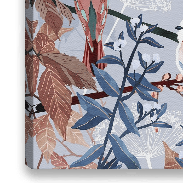 Drei Vögel in kühlen Wintertönen, umgeben von Zweigen, Blättern und Winterbeeren.