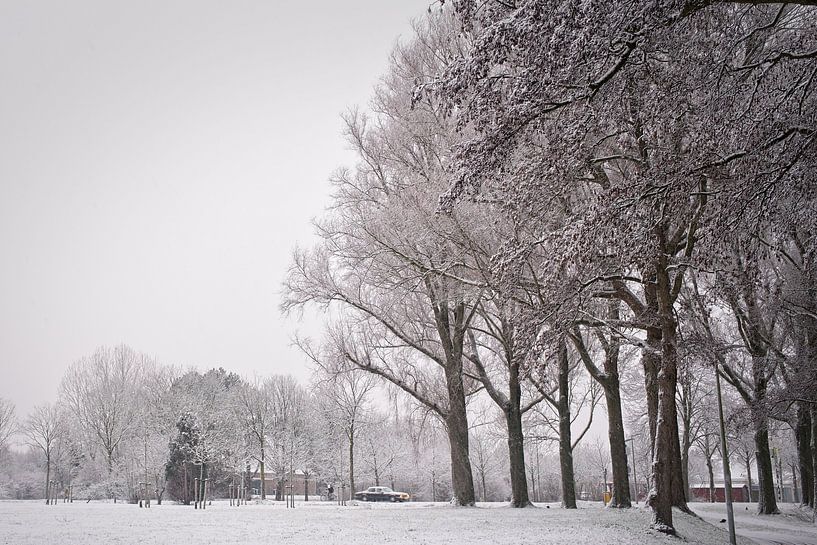Diese stimmungsvolle Winterfotografie zeigt eine ruhige Parkszene unter einer weichen Schneedecke. Imposante Laubbäume dominieren das Bild. Ihre kahlen Äste sind schwer mit frischem Schnee beladen, der ein zartes weißes Geflecht vor dem hellgrauen Winterhimmel bildet. Die Bäume reihen sich entlang einer Art Fußweg oder Parkstraße auf,…