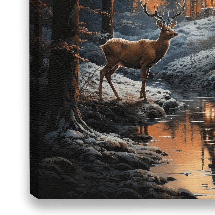 Dieses bezaubernde Bild fängt den Geist von Weihnachten mit einem majestätischen Hirsch ein, der in einer verschneiten Weihnachtslandschaft steht, umgeben von Grün- und Orangetönen. Dieses Kunstwerk passt perfekt in ein weihnachtliches, gemütliches Interieur und bringt die Wärme und Freude der Feiertage in Ihr Zuhause. Die Grün- und…