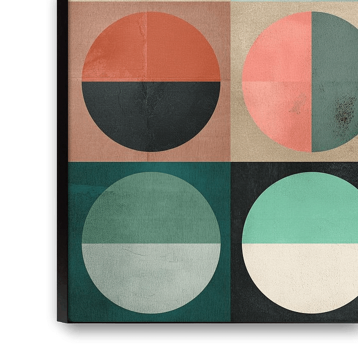 Eine Reihe von Kreisen, in denen sich Farben und Segmente abwechseln. Das klare Muster und die Textur schaffen ein retro-verspieltes geometrisches Kunstwerk.