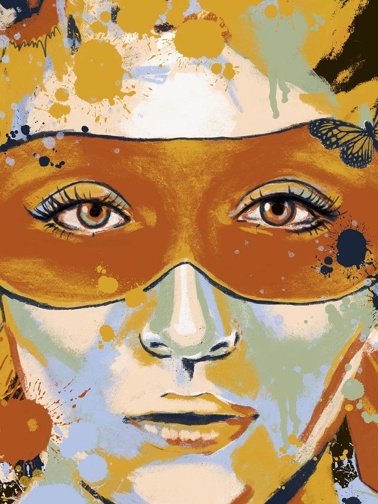 Ein farbenfrohes Porträt einer Frau mit einer Heldenmaske. Diese Arbeit wurde für die Bewegung "Our planet week" zum Thema "Klimahelden" erstellt.