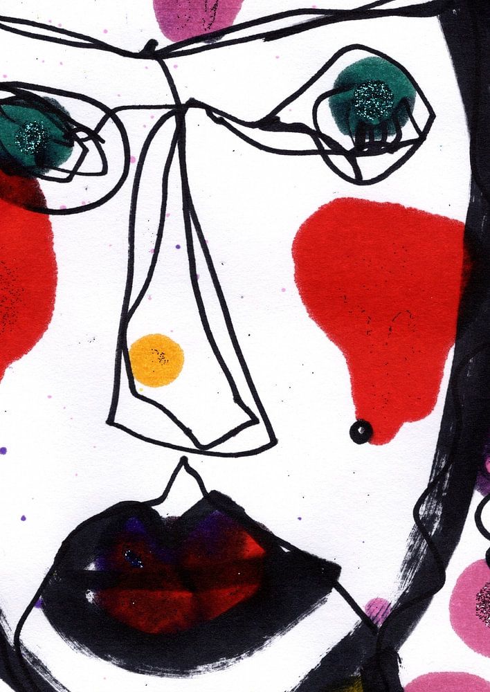Clownhafter Tintenausdruck auf Papier. Ein farbenfrohes Ganzes für Ihre Wand. Ein heiteres Ganzes, besonders in einer Serie, mit anderen Illustrationen. Erstellt von MY HAPPY SOUL ART