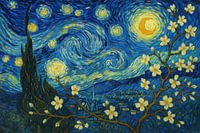 Ein wirbelnder Nachthimmel voller heller Sterne schwebt über einem ruhigen Dorf, während im Vordergrund Mandelblüten leicht hervortreten. Dicke Pinselstriche erzeugen eine fühlbare Textur und betonen den Kontrast zwischen tiefen Blautönen und warmen, leuchtenden Highlights. Auf der linken Seite erhebt sich eine dunkle Zypresse, die die…