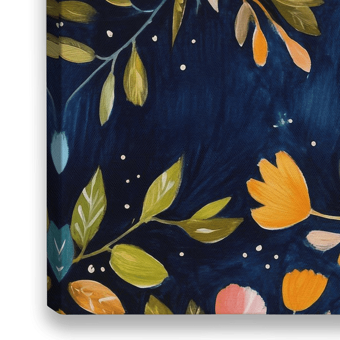 Der dunkelblaue Acryl-Hintergrund dieses floralen Kunstwerks bildet einen auffälligen Kontrast zu den handgemalten Blumen und Zweigen im naiven Stil, die die Komposition einrahmen. Die Blumen in sanften Blush-Tönen und warmen Nuancen sind abstrakt und charmant einfach und vermitteln ein Gefühl von Unschuld und Laune. Die zarten…