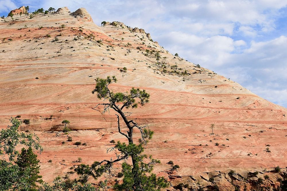 Vorbei an einigen Mesas, die im Zion-Nationalpark, Utah, USA, besonders hervorstechen. Sie haben eine ganz eigene Art, Aufmerksamkeit zu erregen.