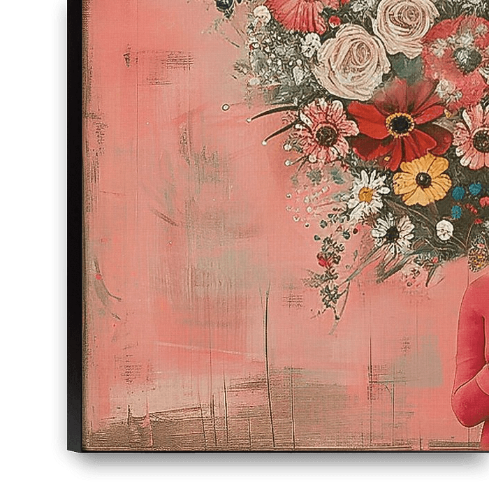 Ein ausdrucksstarkes und poetisches Porträt in zartem Altrosa mit einem üppigen Blumenstrauß. Blumen in warmen und sanften Farbtönen wachsen zu einem Ganzen zusammen, umgeben von Schmetterlingen, die dem Bild Bewegung und Leichtigkeit verleihen. Das Werk handelt von innerem Reichtum, Wachstum und Identität. Nicht das, was äußerlich…