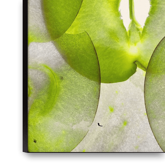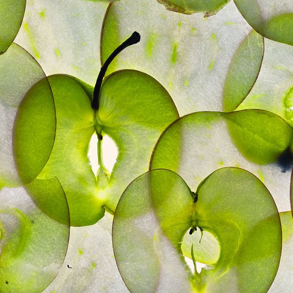 Diese künstlerische Nahaufnahme von grünen Apfelscheiben offenbart eine überraschende Welt der Transparenz und Form. Das Licht spielt durch das frische Grün und hebt organische Linien und subtile Unregelmäßigkeiten hervor. Ein Bild, das Ruhe ausstrahlt und gleichzeitig Neugierde weckt.
