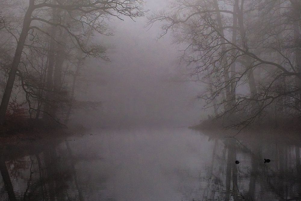 Entlang eines stillen Wasserlaufs stehen kahle Bäume wie Wächter im Nebel. Ihre Formen reflektieren sanft in der glatten Oberfläche, als ob die Stille selbst einen Spiegel gefunden hat. Zwei Vögel ziehen langsam vorbei - klein, aber bedeutungsvoll in dieser stillen Landschaft. Der Nebel dämpft jedes Geräusch, jede Grenze zwischen Luft…