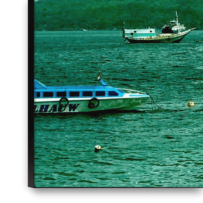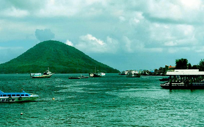 Das Bild zeigt eine lebhafte Hafenszene mit einer großen, kegelförmigen, grünen Insel im mittleren Hintergrund, die von dichter Vegetation bedeckt ist. Das Wasser im Vorder- und Mittelgrund hat eine auffallend teal-grüne Farbe, die von kleinen Wellen gekräuselt wird.
