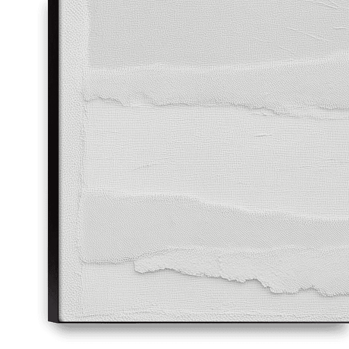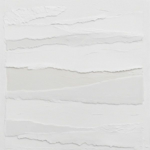 eine subtile Schichtung von Weiß auf Weiß, bei der die Farbe von der Textur abgelöst wird. Horizontale Streifen, wie zerrissene Papierstücke oder abgenutzte Kreideschichten, schaffen ein rhythmisches Muster, das an stille Landschaften, eisige Ebenen oder das Echo einer Erinnerung erinnert.