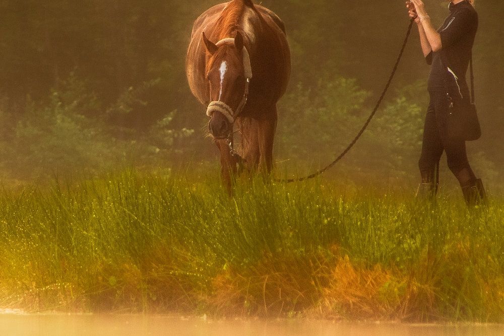Auf einer kleinen, grasbewachsenen Insel am Rande eines spiegelnden Gewässers steht eine Reiterin mit ihrem Pferd - eine Silhouette der Verbundenheit und Ruhe. Die ersten Sonnenstrahlen brechen sanft durch den Nebel und malen die Landschaft in silbrige Grautöne. Der Nebel dämpft jedes Geräusch und lässt den Hintergrund zu einer verträumten Kulisse aus Bäumen und Sträuchern verschwimmen, die die Aufmerksamkeit ganz auf die intime Szene im Vordergrund lenkt.