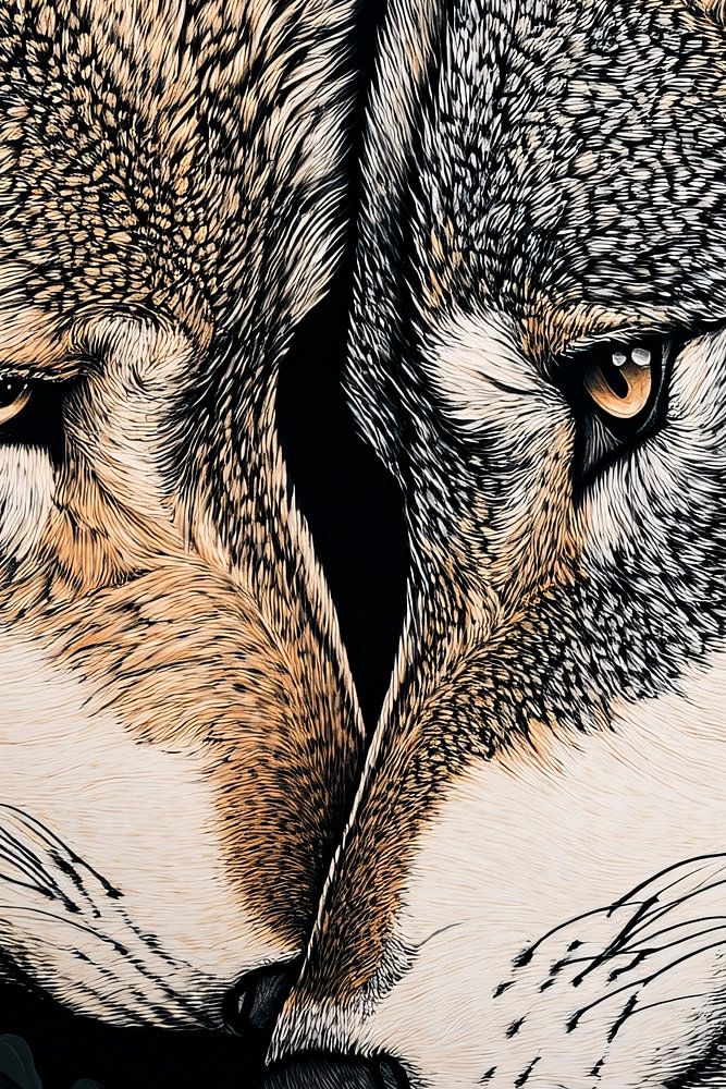 Ein beeindruckendes Kunstwerk, das die Verbindung zwischen Natur und Tieren feiert. Dieses Design zeigt zwei Wölfe aus nächster Nähe, umgeben von schönen floralen Details in einem monochromen Stil. Das Spiel von Licht und Schatten schafft eine dramatische Atmosphäre und macht dieses Design zu einer perfekten Ergänzung für moderne Innenräume oder Liebhaber von Naturkunst. Der starke Kontrast und die detaillierten Linien machen es zu einem echten Blickfang in jedem Raum.