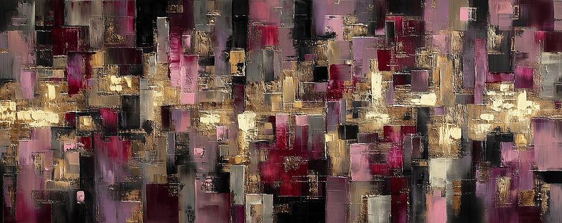 Woonkamer schilderij | Horizon van Goud - Dit grote abstract schilderij werkt als een zachte gloed voor de woonkamer: het zet meteen de toon zonder te schreeuwen. Stel je een brede strook warm metaal voor die als een verborgen horizon door het midden loopt, omlijst door gefragmenteerde vlakken in diepe bordeaux en poederroze,…