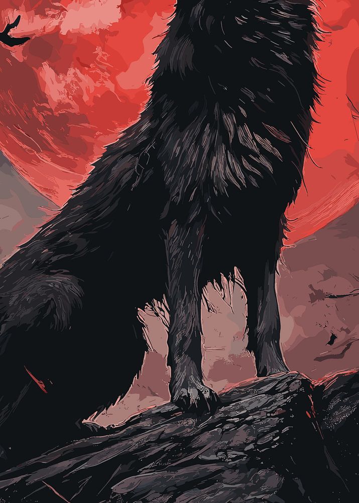 Ein majestätischer schwarzer Wolf steht auf einem zerklüfteten Felsen und heult eindrucksvoll zum Himmel. Im Hintergrund leuchtet ein gewaltiger, blutroter Vollmond, der die Szene in eine mystische und düstere Atmosphäre taucht. Die Umgebung ist geprägt von kargen, verdorrten Bäumen und einer rauen Felslandschaft. Die Farbpalette besteht aus dunklen Tönen mit intensiven roten Akzenten, die die Dramatik des Motivs unterstreichen. Dieses eindrucksvolle Bild fängt die wilde, ungezähmte Natur des Wolfes perfekt ein.