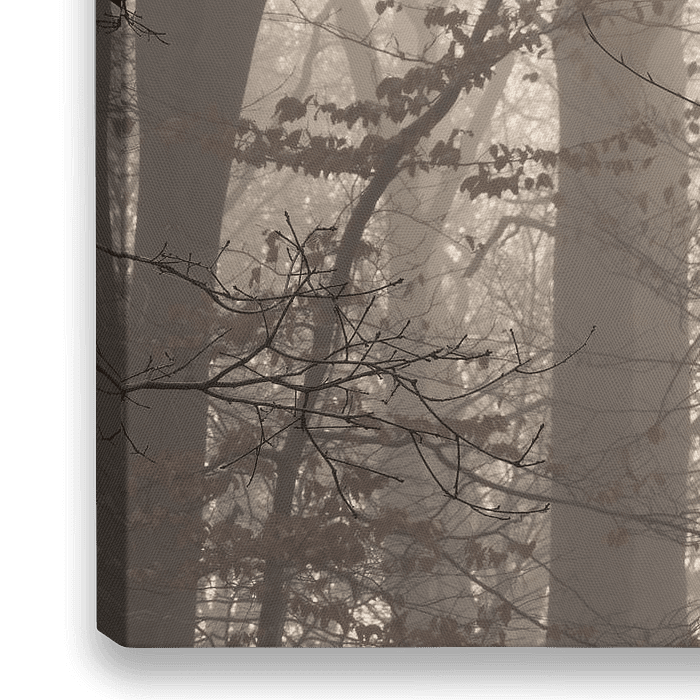 Nahaufnahme von toten braunen Blättern an den Bäumen. Im nebligen Hintergrund bricht die Sonne langsam durch und erzeugt ein warmes Licht.
