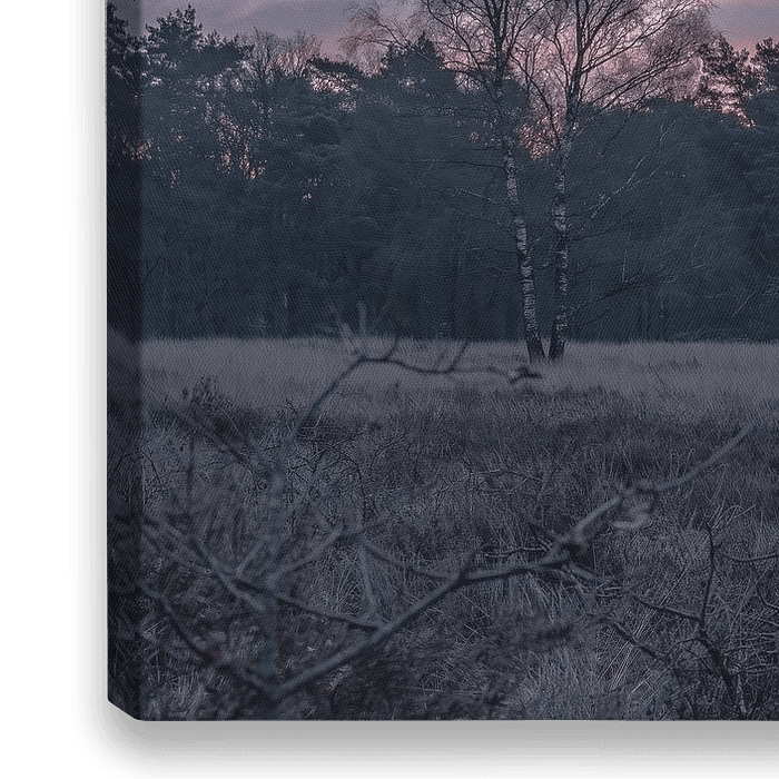 Landschaft in der Wolfhezerheide in Doorwerth, Gelderland, während der blauen Stunde vor Sonnenaufgang, in der die fast aufgehende Sonne einen wunderschönen farbigen Himmel erzeugt