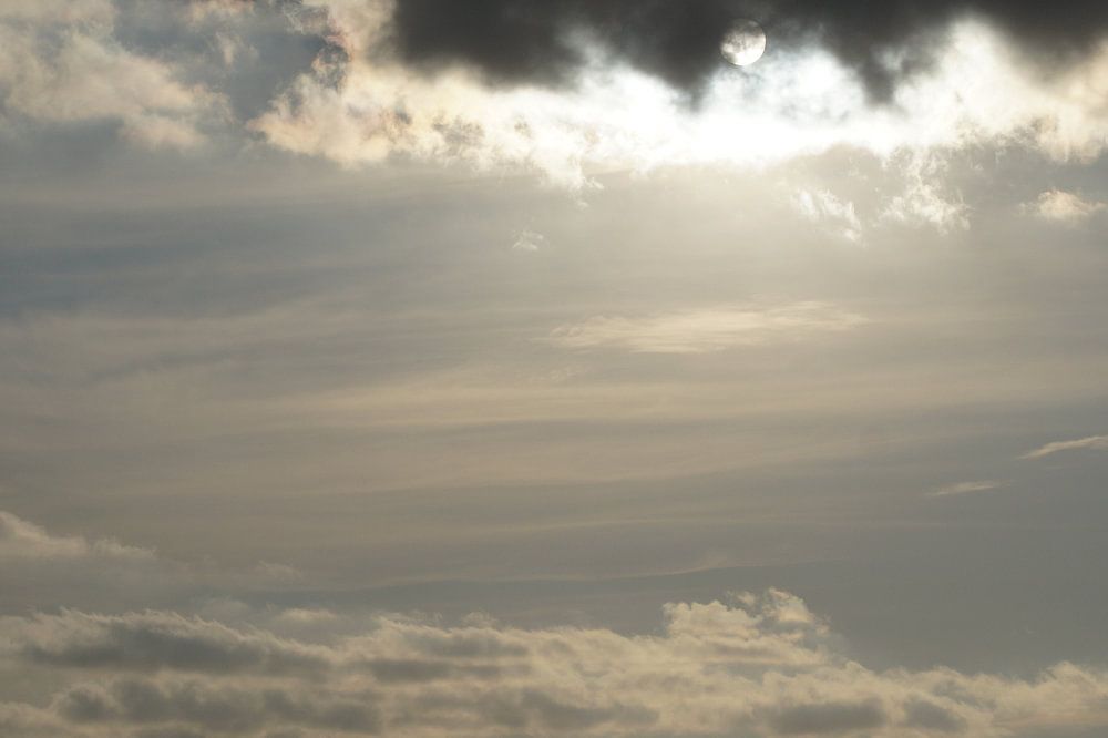 De zee met daarin de weerspiegeling van het water, daarboven donkere wolken die de zon verduisteren.