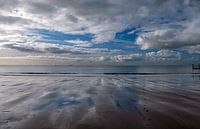 ein schöner Wolkenhimmel, der sich im Wasser am Strand von Zoutelande spiegelt.
