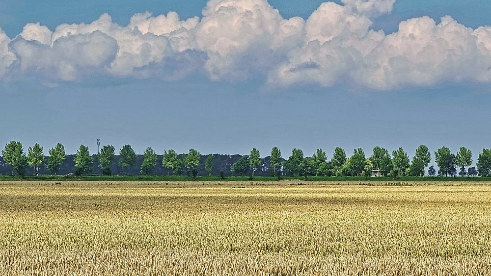Wolkenband über Sommerfeld mit goldgelbem Weizen auf Noord-Beveland