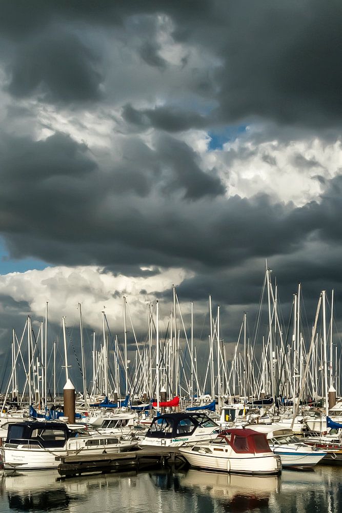 Starke Bewölkung über dem Jachthafen von Breskens an der Westerschelde in Seeländisch-Flandern. Die Sonne warf noch immer ein schönes Licht auf die Vergnügungsjachten und das spiegelnde Wasser im Hafen.