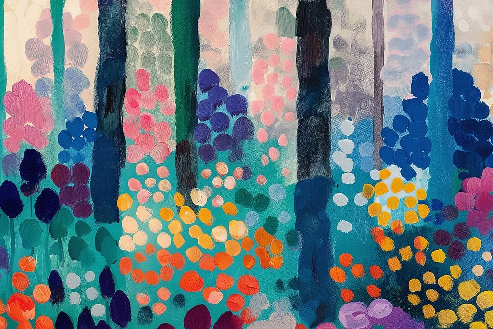 Beim "Woodland Flower Festival" betreten Sie einen Wald, in dem der Blumenteppich und die stehenden Wächter der Bäume ein Fest für die Sinne sind. Blumen in leuchtenden Rot-, Orange- und Violetttönen scheinen sich in einem stillen Tanz zu bewegen, beleuchtet von Lichtflecken, die durch das Blätterdach brechen. Die kühlen Blau- und Grüntöne der Baumstämme bilden einen beruhigenden Kontrast und verleihen dieser Szene sowohl Energie als auch Ruhe. Dieses Werk ist inspiriert von den bezaubernden Momenten in der Natur, wo jeder Blick ein neues Detail offenbart und die tägliche Hektik für einen Moment verschwindet. Perfekt, um Ihrem Wohnraum eine dynamische und doch ruhige Atmosphäre zu verleihen und ein Stück Natur ins Haus zu holen.