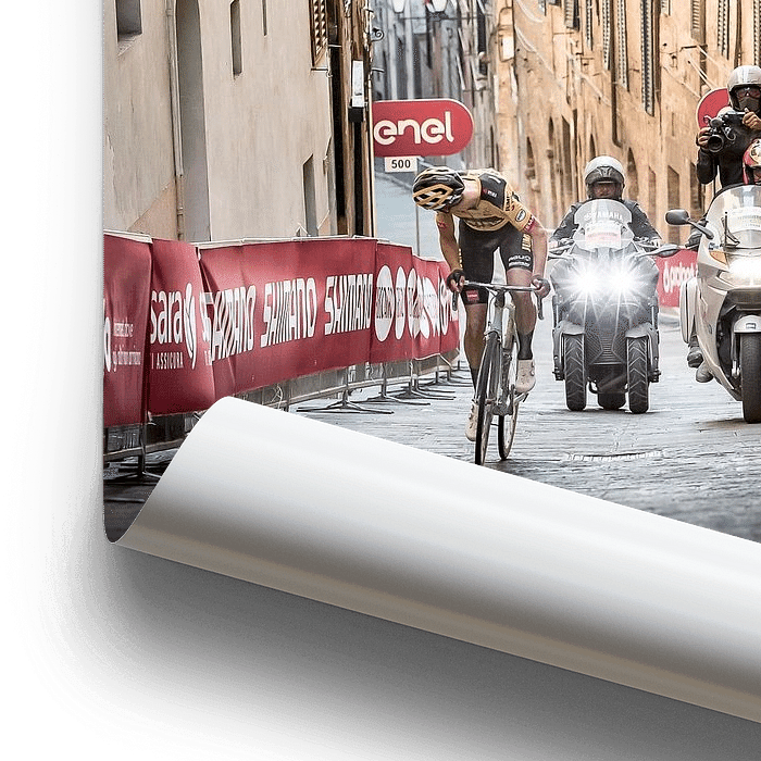 Bestelle das Foto Wout van Aert gewinnt Strade Bianche von Leon van Bon als Reproduktion auf Leinwand, Alu-Dibond, als Poster, Fototapete oder Acrylglasbild.