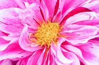 Eine Makroaufnahme einer rosa Dahlie mit gelbem Herz. Die Blütenblätter sehen wie gezeichnet aus.
