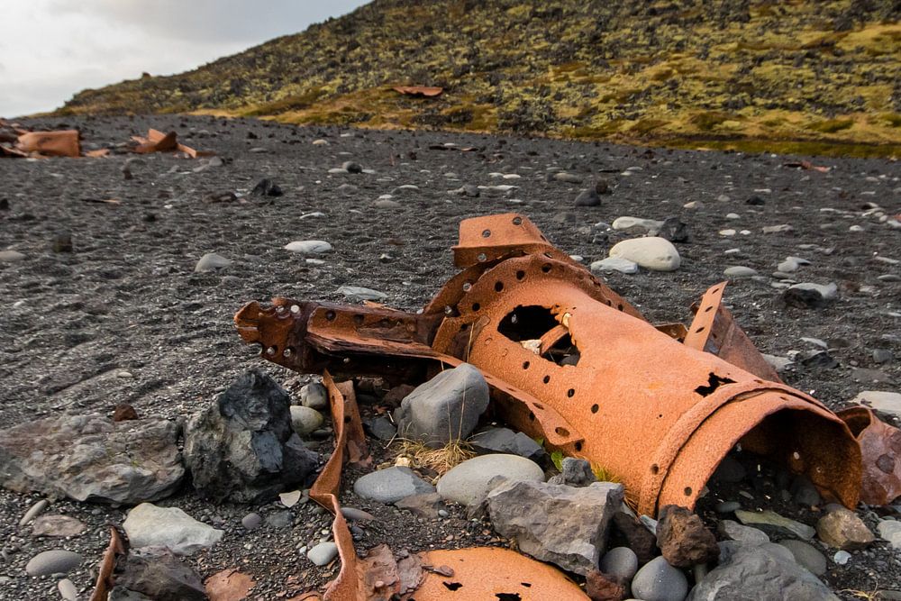 Wrakstukken van een op de kust geslagen schip op het zwarte kiezelstrand van Snaefellsnes in IJsland.